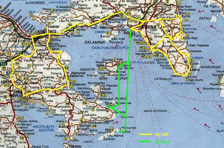 Naturally, our actual travels in Greece, during this week, covered just a small part of the territory of Greece. On the map below, the yellow line is that done by car, over 3 days, the the green line that by boat, on a one day trip. Of course there is MUCH MORE to see ;=()