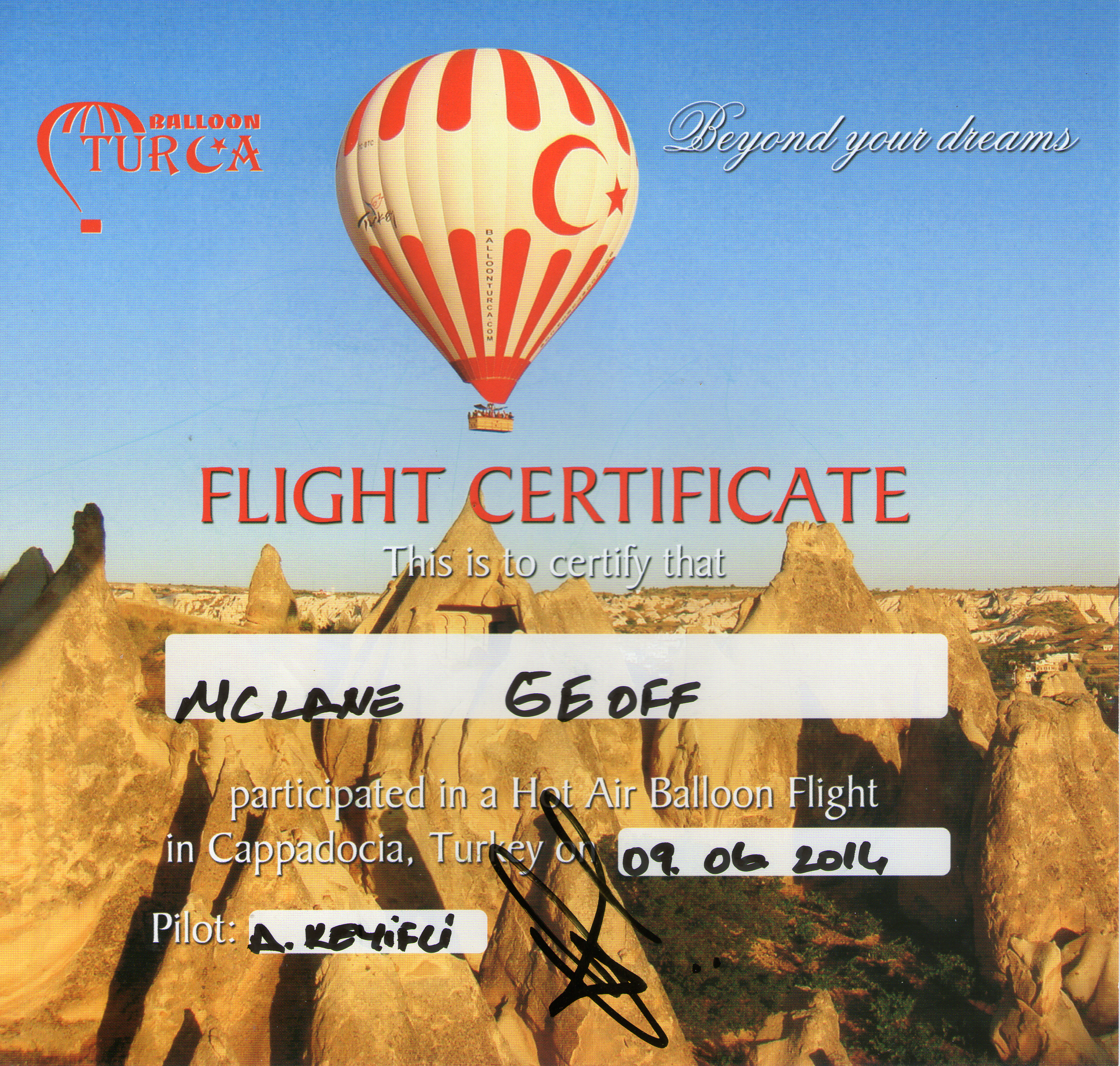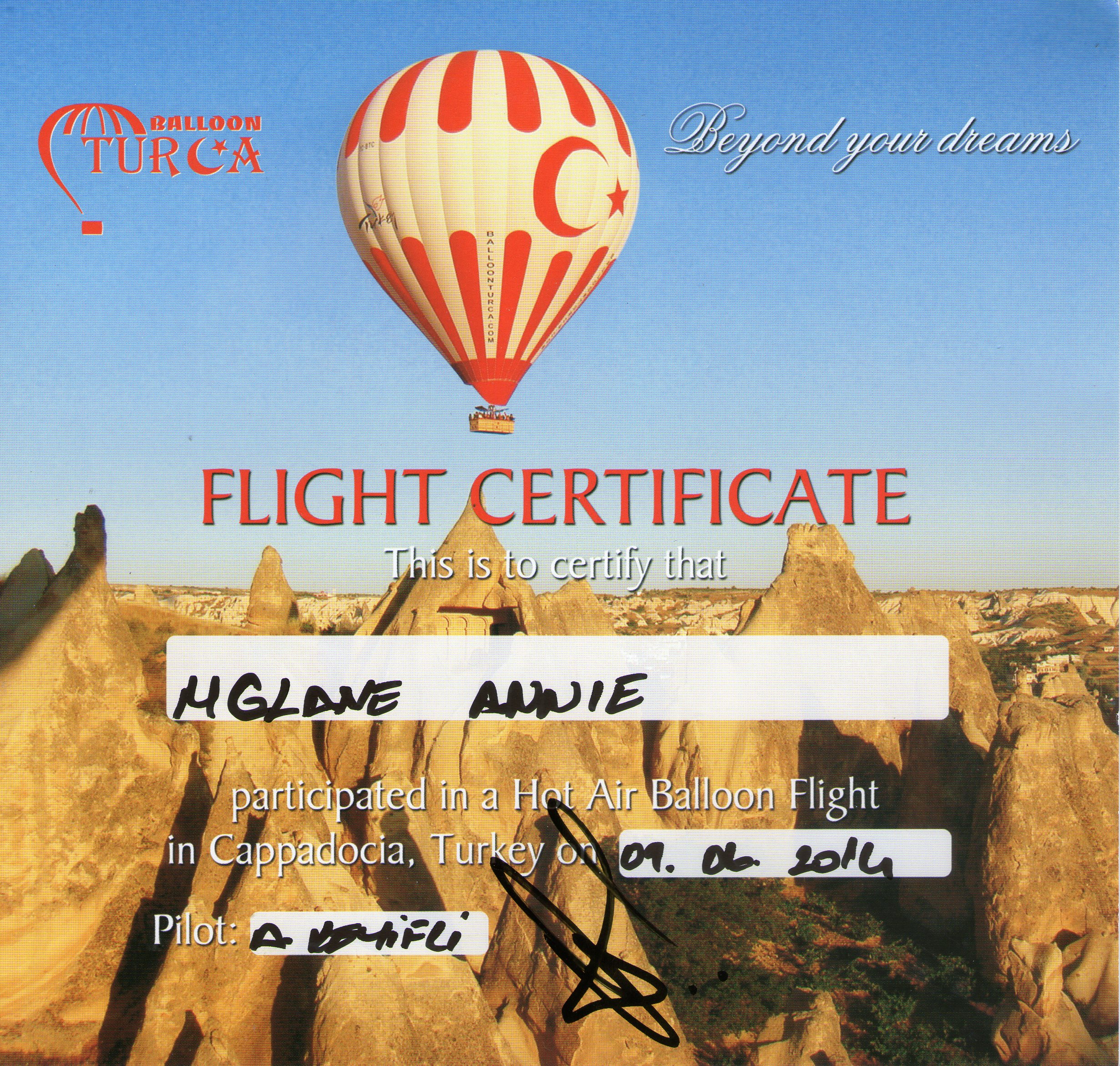 2014/06/09: Click on the image to load the full image in a new window. These 'Flight Certificates' were acquired after a 1 hour and 10 minute flight in a big hot air balloon, in Cappadocia, Turkey, Latitude 38.648, longitude 34.8448 approx, with about 20 other passengers. Although I heard the pilot mention an altitude of 1,700 meter, I think he was using AMSL, since I am sure we were only at a few thousand feet AGL, and this district is at about 900-1,000 AMSL. Certainly a very beautiful and enjoyable flight..
